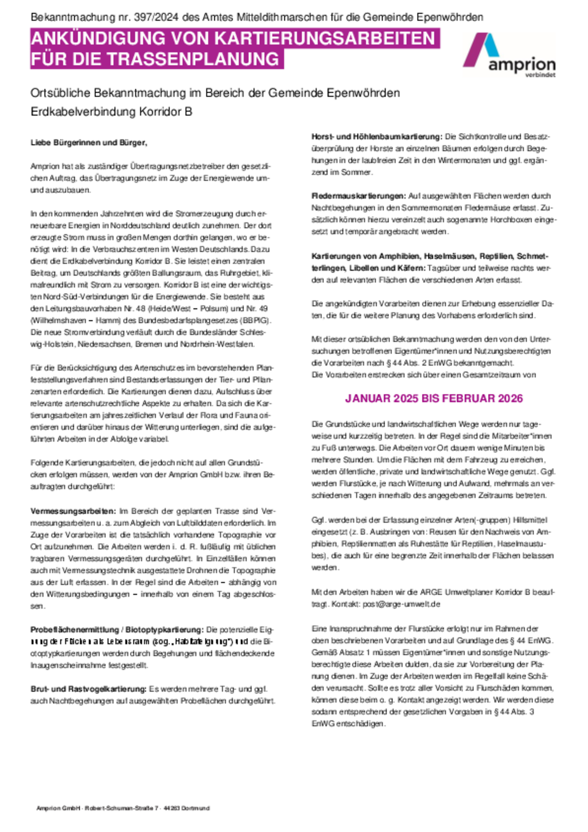 Amprion GmbH: Ankündigung von Kartierungsarbeiten für die Trassenplanung - Ortsübliche Bekanntmachung im Bereich der Gemeinde Epenwöhrden- Erdkabelverbindung Korridor B