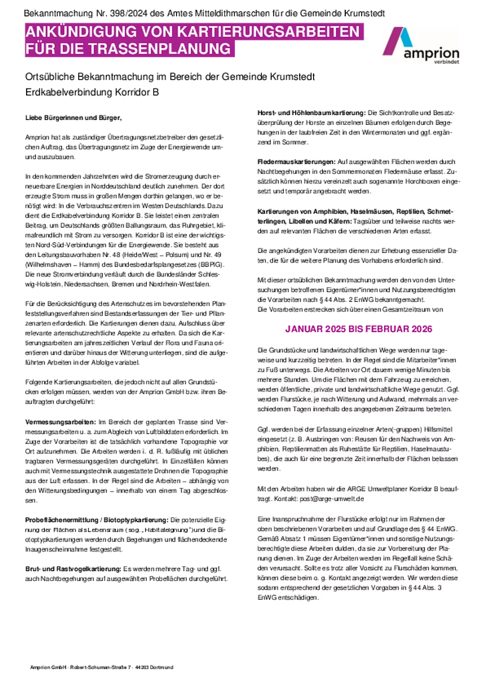 Amprion GmbH: Ankündigung von Kartierungsarbeiten für die Trassenplanung - Ortsübliche Bekanntmachung im Bereich der Gemeinde Krumstedt - Erdkabelverbindung Korridor B