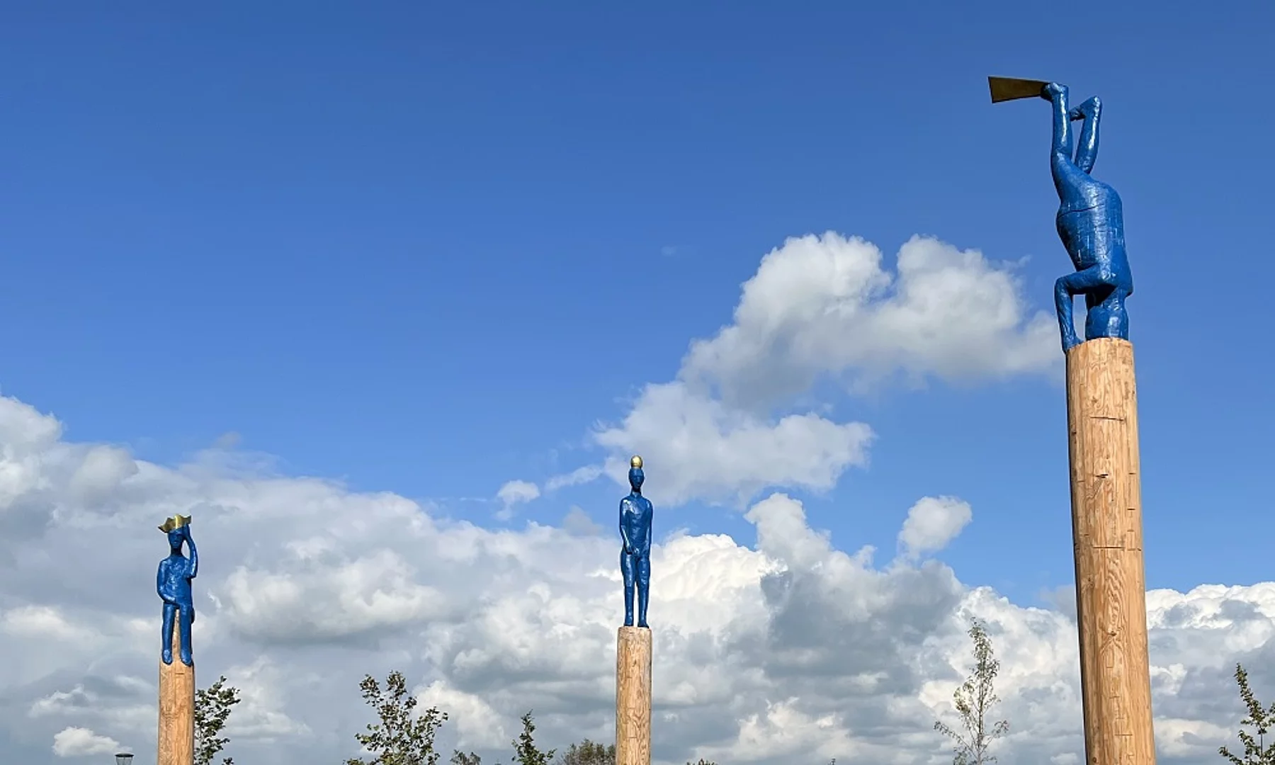 Die drei aus alten Dalben geschnitzten Stelen mit Figuren an der Spitze entwickeln Meldorf weiter zur Kunststadt“