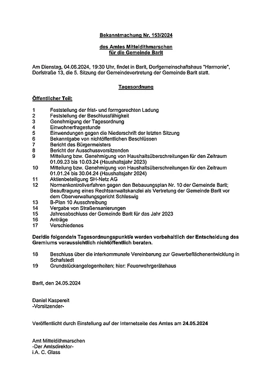 Am Dienstag, 04.06.2024, 19:30 Uhr, findet in Barlt, Dorfgemeinschaftshaus "Harmonie", Dorfstraße 13, die 5. Sitzung der Gemeindevertretung der Gemeinde Barlt statt.