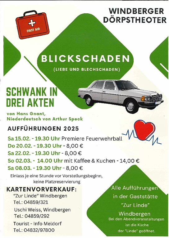 Liebe und Blechschaden - Vorstellung des Windberger Dörpstheoters - Schwank in drei Akten Von Hans Gnant, Niederdeutsch von Arthur Speck Bei den Abendvorstellungen ist die Küche der Linde geöffnet.
