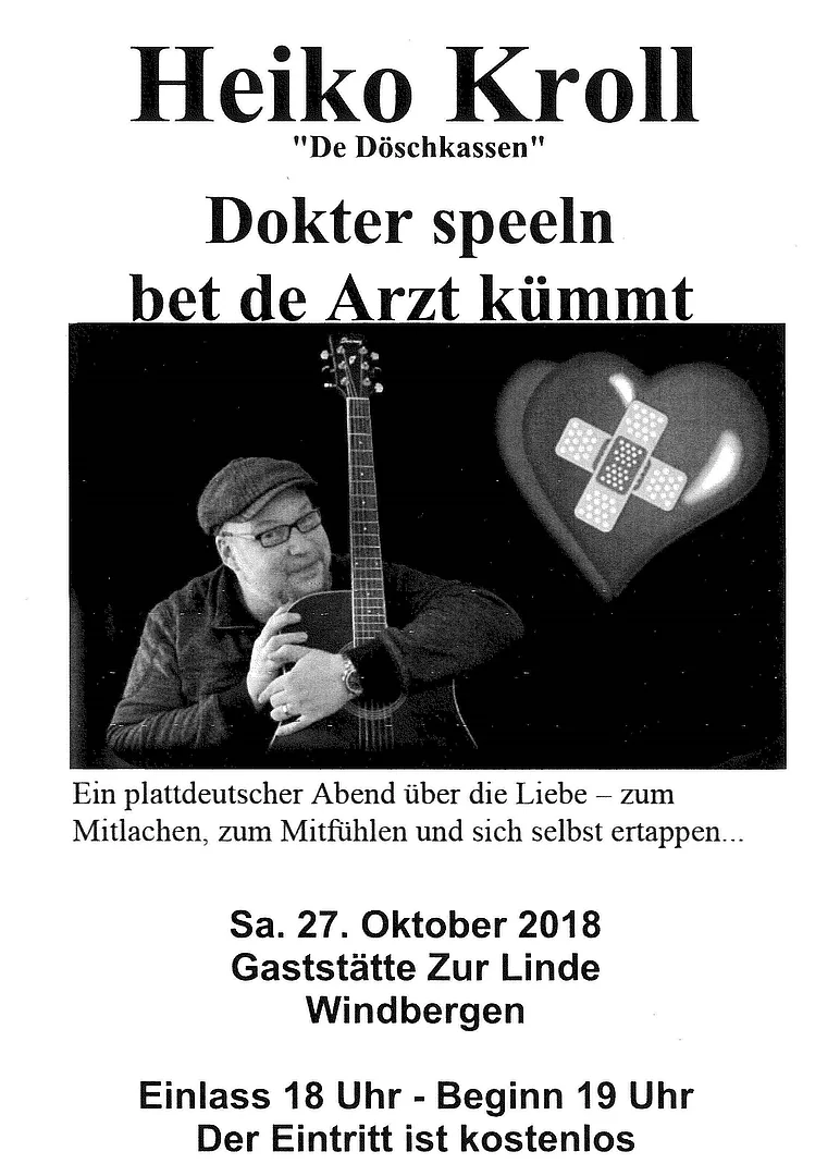 "Doktor spelln bet de Arzt kümmt" Ein plattdeutscher Abend über Liebe - zum Mitlachen, zum Mitfühlen und sich selbst ertappen Einlass ab 18.00 Uhr