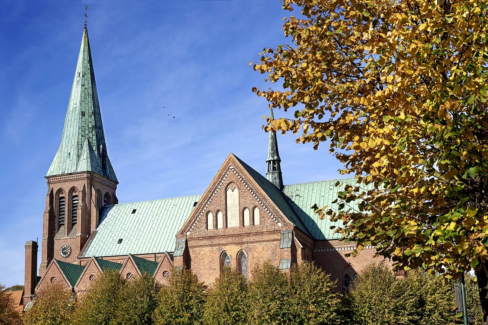 Dom mit blauem Himmel und Bäumen mit Herbstlaub im Vordergrund