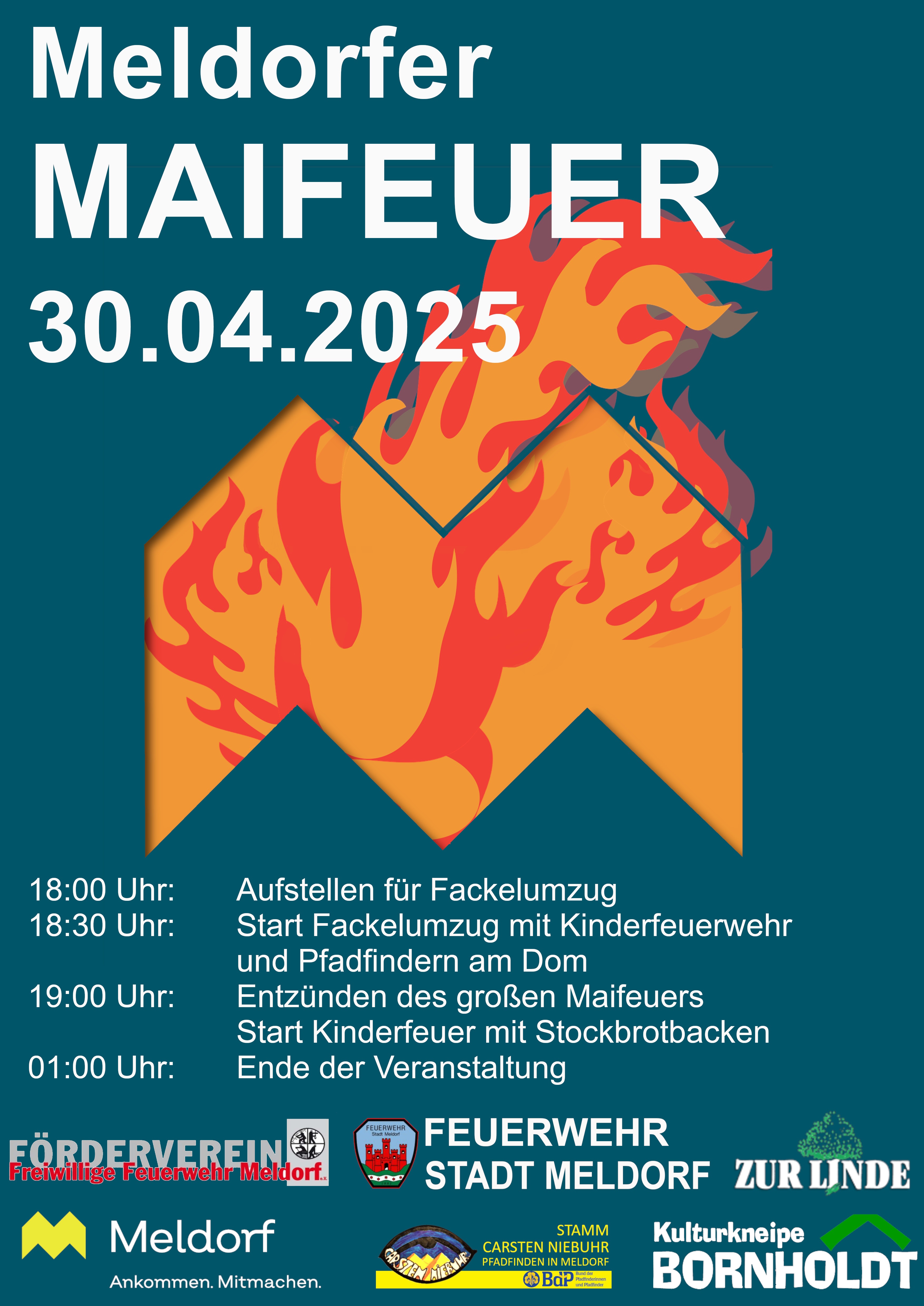18:00: Aufstellen für Fackelumzug (Dom) 18:30: Start des Fackelumzugs mit Kinderfeuerwehr und Pfadfindern (Dom) 19:00 Entzünden des großen Feuers und Start des Kinderfeuers mit Stockbrotbacken Ende der Veranstaltung ca. 1:00