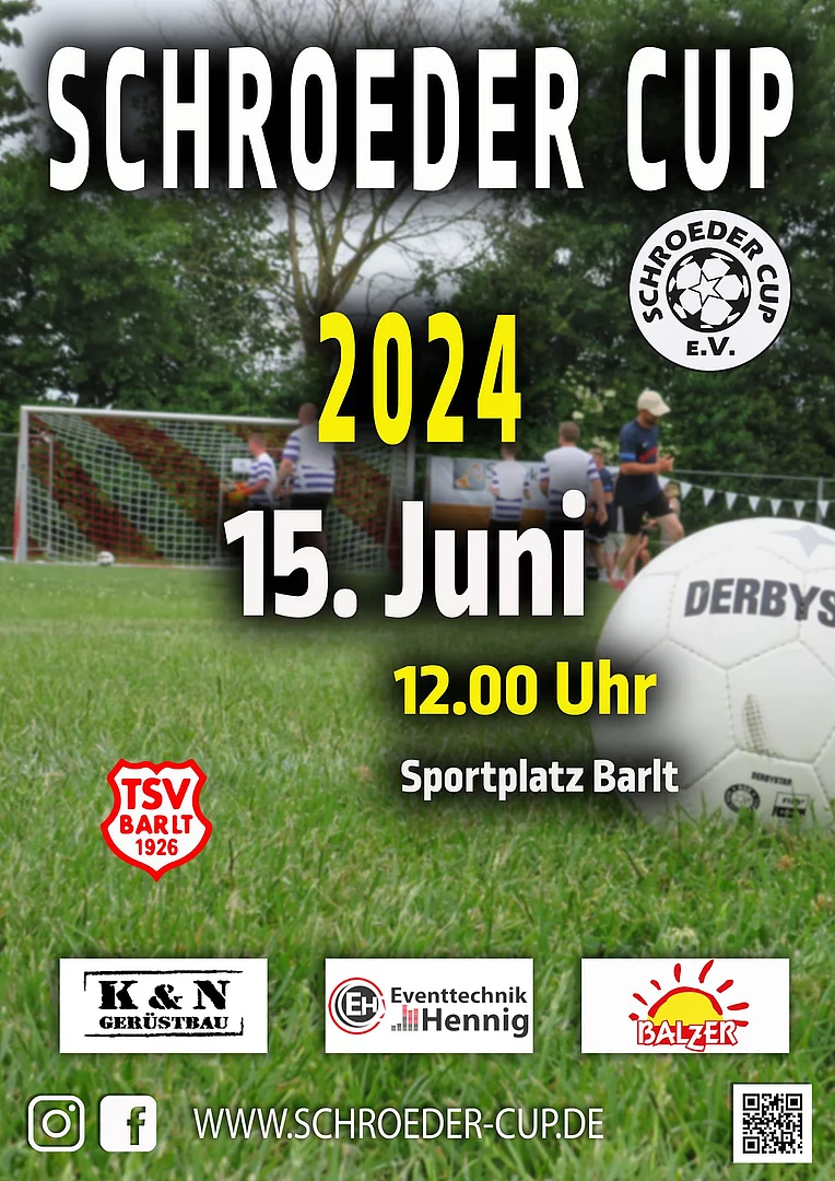 Am 15.06. ist wieder Champions League in Dithmarschen - der Schroeder Cup in Barlt! Neben Fussball der Extraklasse gibt es mehrere Essens und Getränkestände, um für das leibliche Wohl zu sorgen. Wir laden Euch herzlich zu diesem Spektakel ein und freuen uns auf Euch!