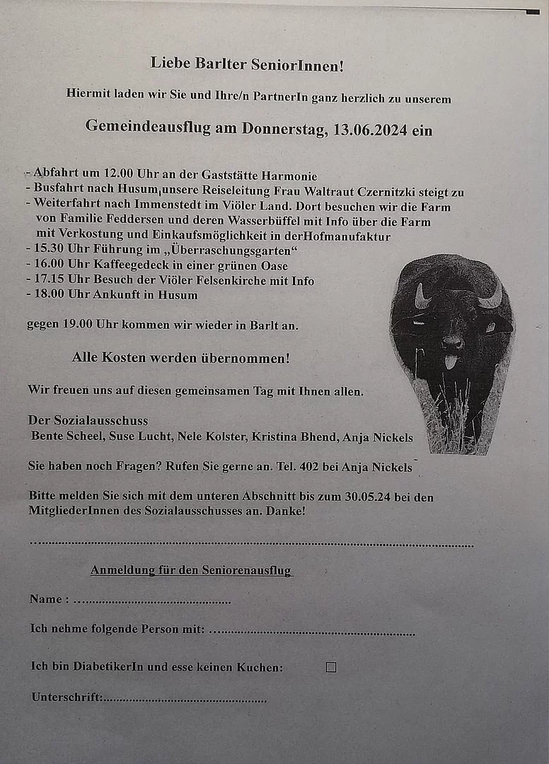 Die letzten Feinheiten müssen noch ausgearbeitet werden, aber der grobe Plan steht. Wir werden nach Immenstedt fahren und dort die Wasserbüffel besuchen, Kaffee und Kuchen darf natürlich auch nicht fehlen und begleitet werden wir von Frau Waltraut Czernitzki aus Husum.