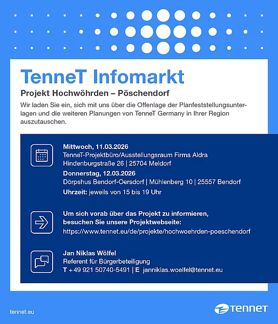Tennet Infomarkt lädt alle Interessierten zu einem Informationsnachmittag über das Projekt "Hochwöhrden-Pöschendorf" in das Tennet-Projektbüro - Ausstellungsraum Aldra - nach Meldorf ein.