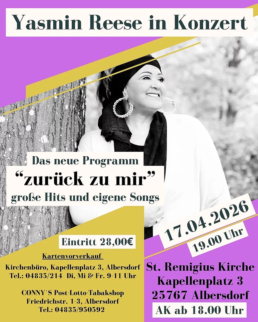 Mit ihrem neuen Konzertprogramm „zurück zu mir“ lädt Yasmin Reese zu einem besonderen musikalischen Abend in die St. Remigius Kirche in Albersdorf ein. Nach über 40 Jahren Bühnenerfahrung auf drei Kontinenten besinnt sich die Sängerin mit diesem Programm bewusst auf ihre musikalischen Wurzeln – persönlich, authentisch und berührend. Einlass ab 18 Uhr